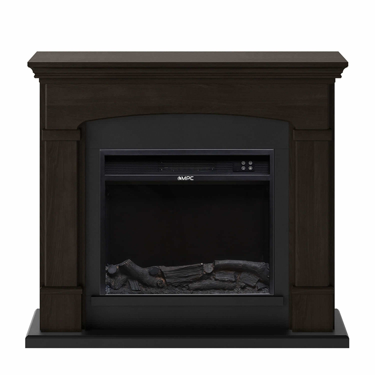 Foyer électrique mural complet moderne et élégant. Le cadre de la cheminée Siena présente une finition en placage de bois de couleur wengé de haute qualité, un panneau central légèrement arqué, des colonnes plates de style toscan et un dessus solide avec un bord sculpté.