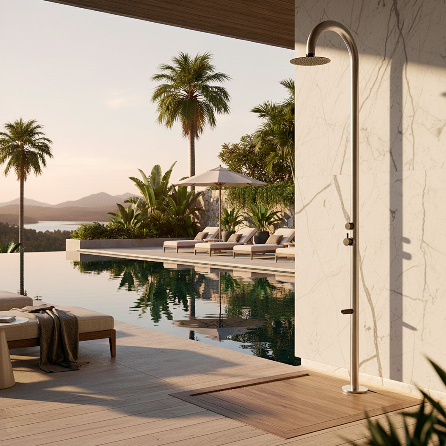 In tegenstelling tot buitendouches met zonneverwarming hoeft u zich geen zorgen te maken over het plaatsen van deze douche in direct zonlicht. De enige beperking is uw keuze.